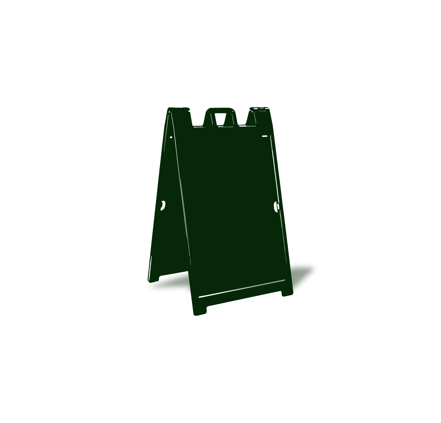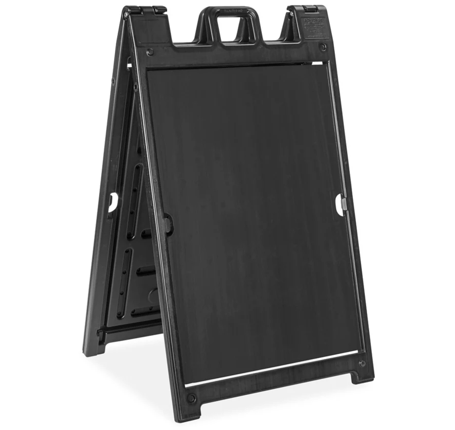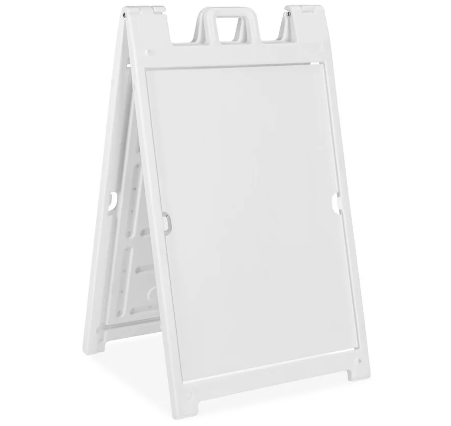 Weighing approximately 20 lbs., this A-frame sign includes a built-in handle for easy carrying, setup, and repositioning. -